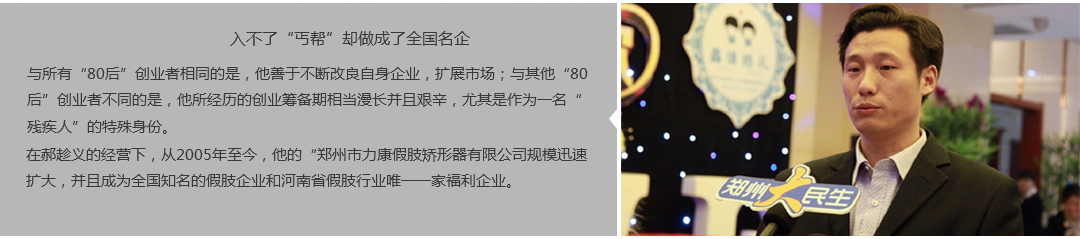 鄭州市力康假肢矯形器有限公司(簡(jiǎn)稱力康),是一家專業(yè)從事假肢矯形器的設(shè)計(jì)、研發(fā)、制作及裝 配的專業(yè)機(jī)構(gòu)。成立于1992年是河南省唯一一家福利企業(yè)。力康下設(shè)業(yè)務(wù)部、技術(shù)部、住院部、康復(fù) 部、售后服務(wù)部,并配有現(xiàn)代化的裝配車間和功能齊全的訓(xùn)練大廳,為殘疾朋友康復(fù)訓(xùn)練提供了可靠 保障。總經(jīng)理穿戴假肢多年,有著豐富的臨床經(jīng)驗(yàn)和親身體會(huì);多年來(lái),力康已為全國(guó)幾十萬(wàn)名殘疾 朋友安裝上舒適、美觀、耐用的假肢和矯形器具,使他們更大限度地恢復(fù)了正常的工作和生活?!爱a(chǎn) 品即人品”的質(zhì)量理念、先進(jìn)的技術(shù)、實(shí)惠的價(jià)格、完善的售后服務(wù)是力康取勝的法寶……